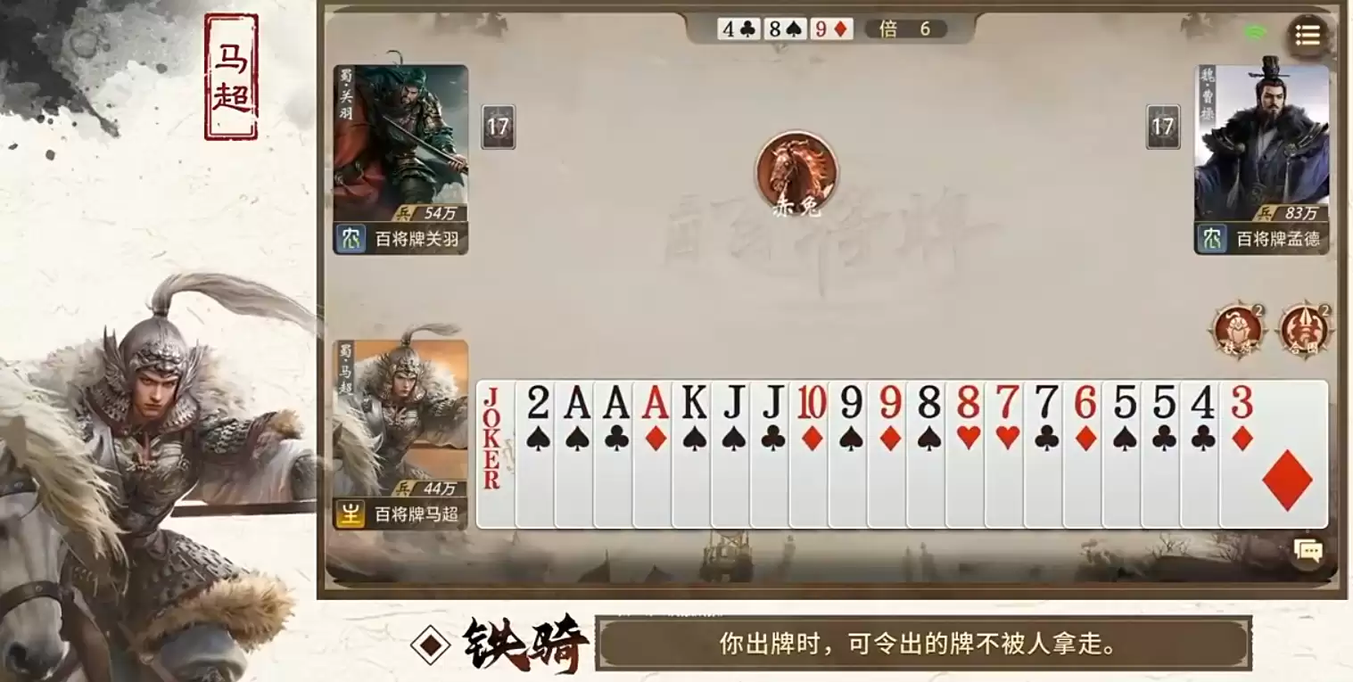 具体而言,“铁骑”能够防止其他玩家获取马超打出的牌,有效保护关键手牌不被截取;而“合围”则允许马超查看一名玩家本局已出牌记录,并将这些牌与手牌组合进行压牌。值得注意的是,每局游戏中“合围”最多发动两次,若该技能打出炸弹,剩余次数将直接清零。