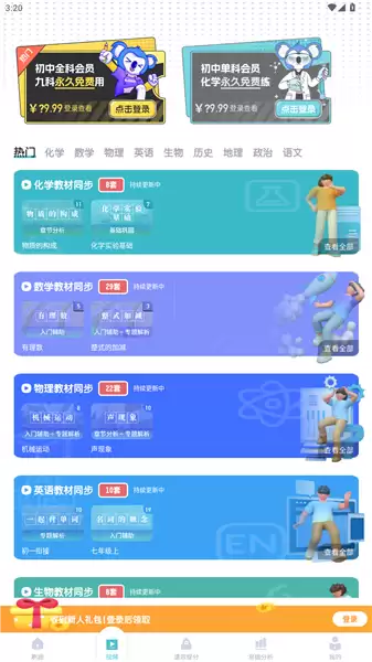 切换到视频栏目,你会发现更多学习资源。除了化学教材的同步讲解之外,这款软件还涵盖了初中所有学科的学习资料。无论是课前预习还是课后复习,这些视频都能为你提供有力支持。