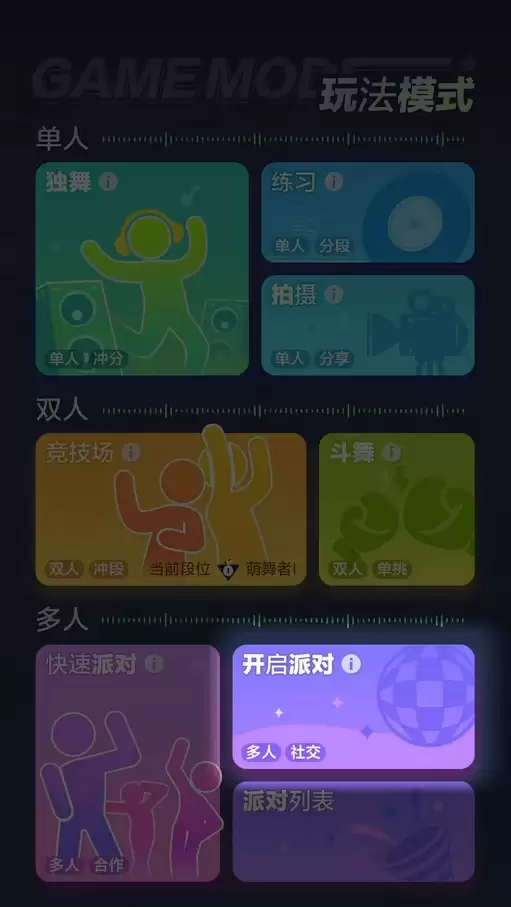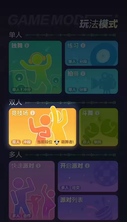 首先,了解一下游戏的基础模式会更有帮助。《舞力全开:派对》的游戏界面主要分为单人、双人和多人三种类型。单人模式中,你可以选择独舞、练习或拍摄;双人模式则包含竞技场和斗舞等玩法;而最热闹的多人模式,正是实现“派对”精髓的地方,包括了快速派对、开启派对和派对列表等功能。