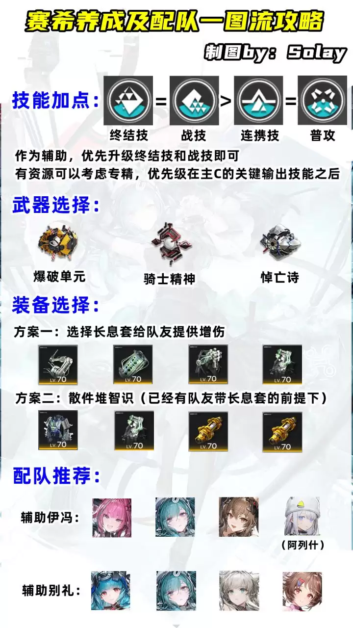 如果你的养成资源足够充裕,可以考虑专注于某个技能的专精。通常建议,在队伍中主要核心输出角色的关键技能之后,再来提升赛希的专精等级,从而最大化整个队伍的爆发潜力。