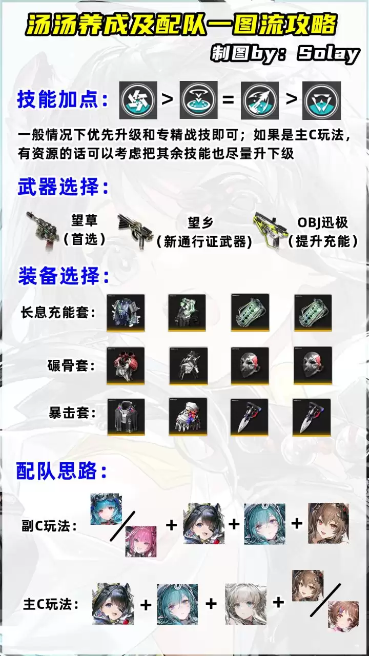 - 主C思路:汤汤自身伤害不俗,完全有能力担当队伍的输出核心。此时,队伍构建应围绕保护她和为她创造输出环境展开。