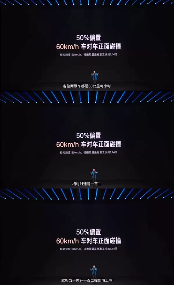 发布会上,我在说明两车各60km/h对撞的相对速度时,补充提及“相当于120km/h时速撞墙”,这一类比的确存在技术偏差。感谢各位专业人士的指正与探讨。