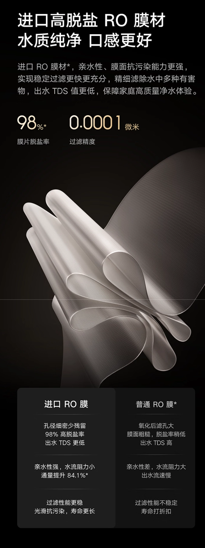 在长期使用成本与效率上,这款产品同样经过优化。其RO滤芯设计寿命长达8年,总净水量达29.2吨,大幅降低了单次过滤成本。1200G与1600G的大通量配置,保障了即滤即饮的澎湃水流,彻底告别接水等待。