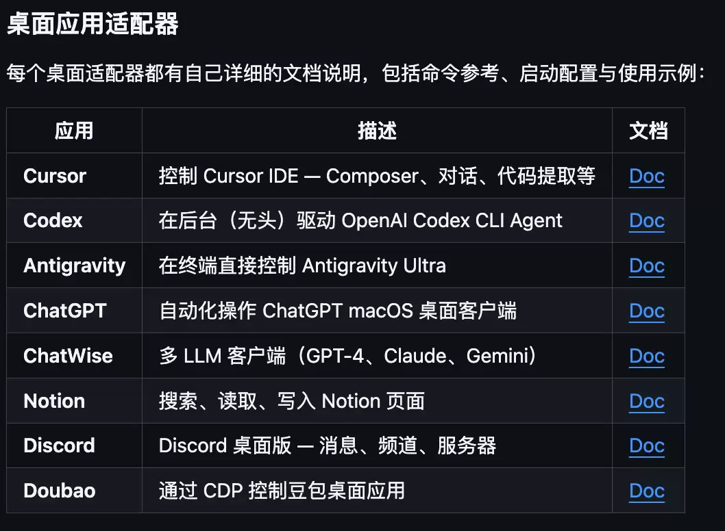 它的能力不限于浏览器。众多主流桌面应用,如Cursor、Codex代码编辑器,Notion笔记工具,Discord以及豆包AI,都能通过命令直接操控。
