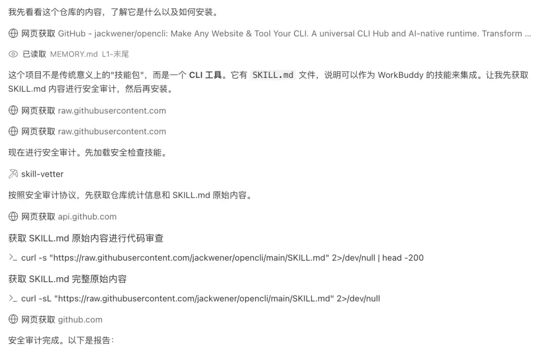安装前会触发安全技能(skill-vetter)的自动审计。在AI联网时代,这一步骤对防范潜在数据泄露至关重要。