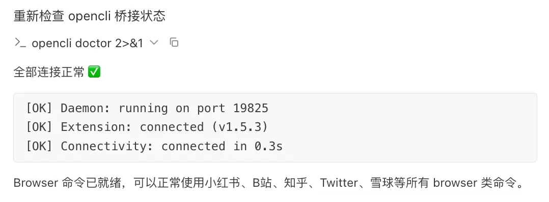 opencli Browser Bridge扩展已经启用,检查桥接状态