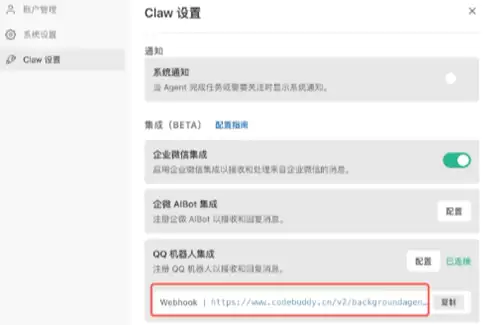 1. 复制地址:从WorkBuddy的设置中复制已生成的完整Webhook URL。