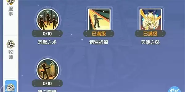 神官阶段:治愈之光5,圣光复苏(剩余技能点可后续补满),纯洁百合花10,牺牲祈福10,天使之怒15。这是辅助能力的升华,特别是天使之怒,能极大提升队友的爆发伤害。