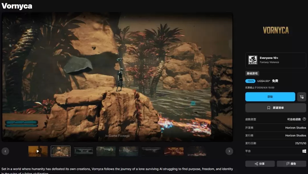 Epic Games Store本周的免费游戏现已更新。独立动作游戏《Vornyca》目前可免费领取并永久添加到你的游戏库中。本次限免活动将于北京时间4月4日下午3点结束,建议玩家尽快完成领取操作。