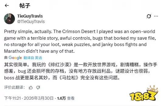游戏媒体IGN曾为《红色沙漠》给出6分评价。评测编辑Mitchell Saltzman在长达130小时的体验后,指出了战斗系统重复、叙事逻辑混乱以及影响体验的持续性故障等核心缺陷。近期,情况有了新的动向:在Saltzman为《马拉松》打出9分高分后,社区反馈促使他重新考虑对《红色沙漠》的评分。Saltzman公开回应,他正推动编辑部在未来数月内对这款游戏进行正式的重新评测。“自初版以来,其更新幅度已足够巨大,”他表示,“投入时间进行二次评估是完全合理的。”