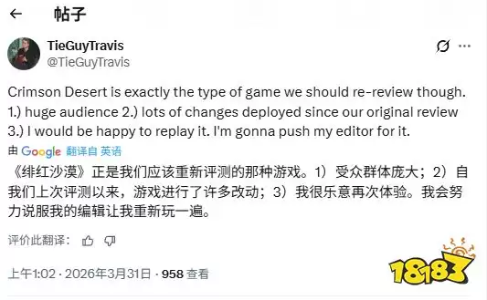 回顾最初的评测,Saltzman的批评相当直接:叙事节奏失控、角色操作反馈迟滞、存在导致存档损坏的恶性漏洞,关卡谜题设计缺乏深度,首领战机制也未能自圆其说。但正是基于这些激烈的负反馈,他认为在游戏即服务的行业现状下,对经过深度内容迭代的作品进行重评,已成为评测媒体的重要职责。而《红色沙漠》具备重评的所有要素:庞大的玩家社群基础、核心玩法与内容的大规模更新,以及评测者本人愿意重新投入时间的意愿。鉴于此,他已正式向IGN编辑部提议开启重评流程。不过,目前IGN官方仍未公布任何确切的计划与时间表。