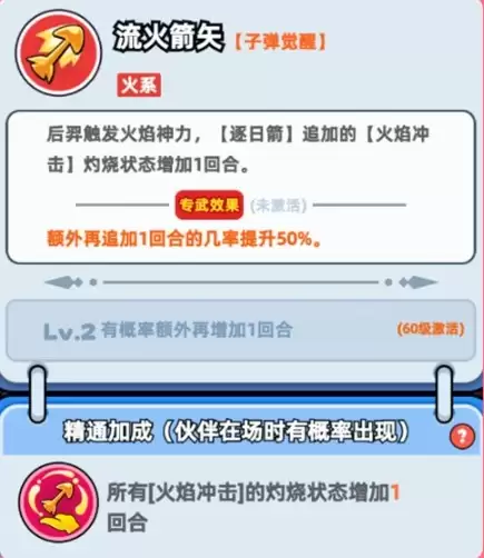 【流火箭矢】后,所有火子弹触发的【火焰冲击】灼烧状态增加1回合。这意味着灼烧总时长从2回合变3回合,灼烧伤害直接提升50%,配合火系神铸符文效果更炸。
