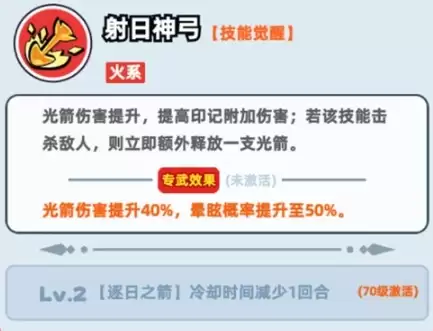 50级觉醒【射日神弓】后,光箭伤害提升,印记附加伤害提高。最关键的是一若该技能击杀敌人,立即额外释放一支光箭,形成斩杀连射效果,清场能力质变。