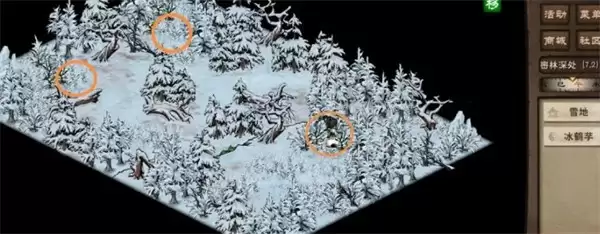 5、点击跃下后会来到密林深处,在(7,2)(1,1)(1,4)三处采集冰鹤芋。