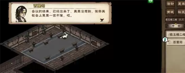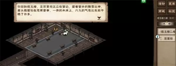 7、去(32,5)触发剧情,然后原地挖掘三次触发剧情,再原地对话白雁声,返回揽玉楼二楼对话百里司(8,3)后离开。