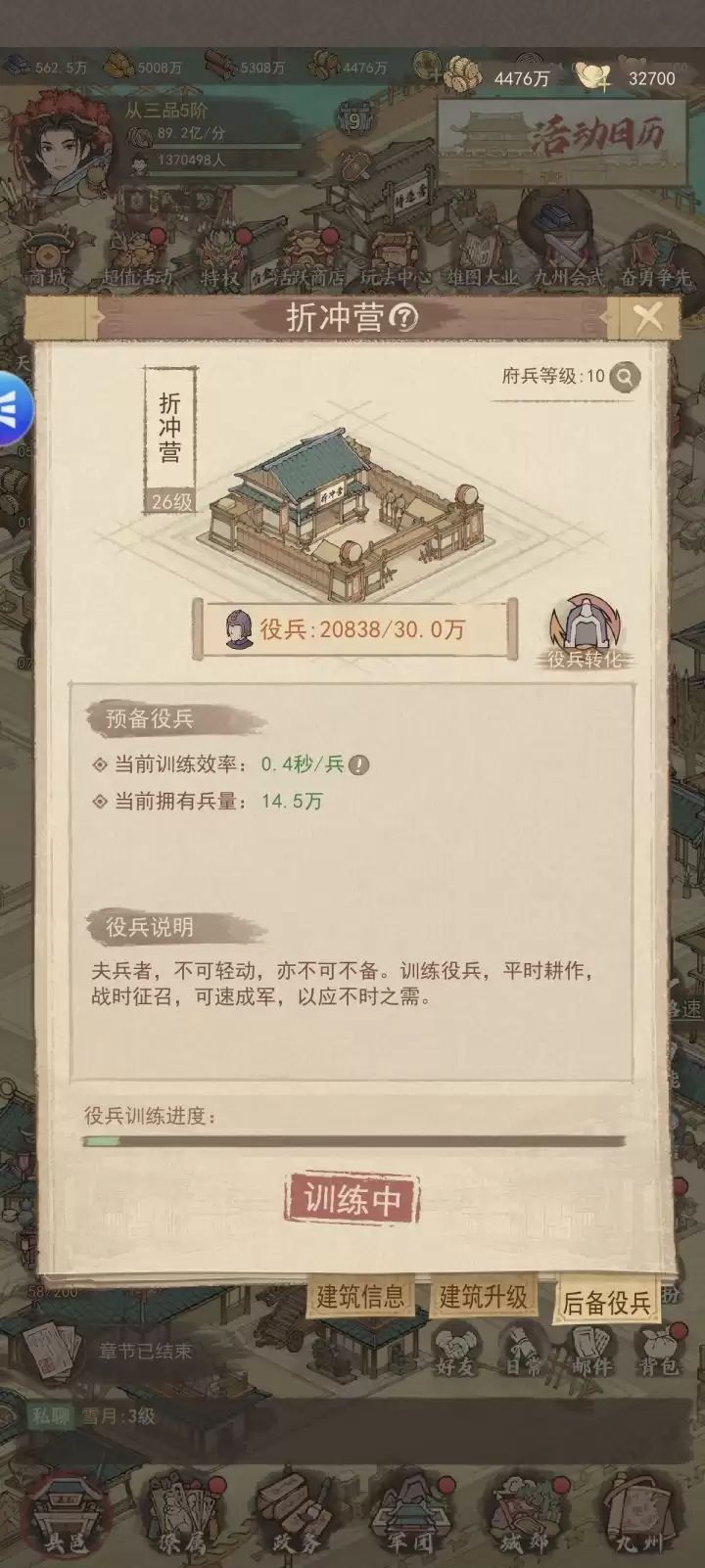 当折冲府兵力低于25万时,后备役练兵速度为0.4秒/兵;超过25万后,速度会下降至2.1秒/兵。