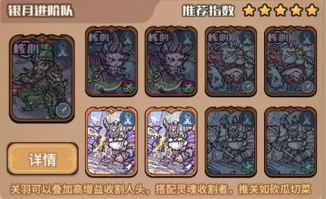这套以关羽为核心的银月进阶阵容,是攻克高难度PVE关卡的终极答案。它通过灵魂收割者与食人族魔法师的协同,构建出后期无解的伤害模型。雷电与冰霜矮人战士的加入,则提供了坚实的屏障与控制链。阵容完全围绕银月城阵营构建,确保所有光环和增益效果全域叠加,从量变引发质变,最终成长为碾压战场的数值怪兽。