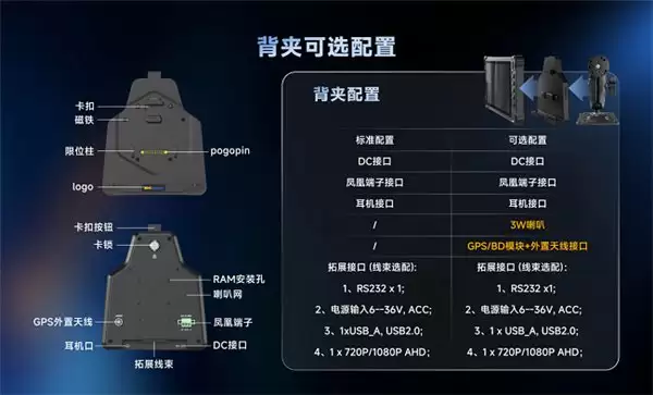 V82T 标配的一体化车载背夹是其灵活部署的核心。它集成了RS232、AHD视频输入、USB等丰富接口,可快速连接各类车载终端与摄像头。其宽压输入(6-36V)设计并支持ACC点火自启,兼容从轻型配送车到重型卡车的不同电气系统。背夹还预留了增强型GNSS模块与外置SMA天线接口,结合选配的高功率喇叭,确保了城市峡谷等复杂环境下的定位精度与语音指令清晰度。