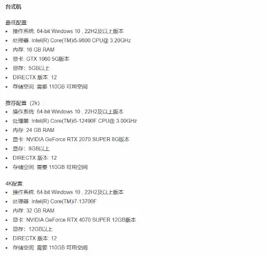 对极致画质的追求,则进一步明确了性能门槛。官方推荐的4K高画质预设配置,已对标RTX 4090级别的旗舰显卡。这一标准的核心目标,是在顶级视觉渲染下保障全程稳定高帧率运行,旨在为拥有次世代硬件的玩家提供无妥协的沉浸式体验。
