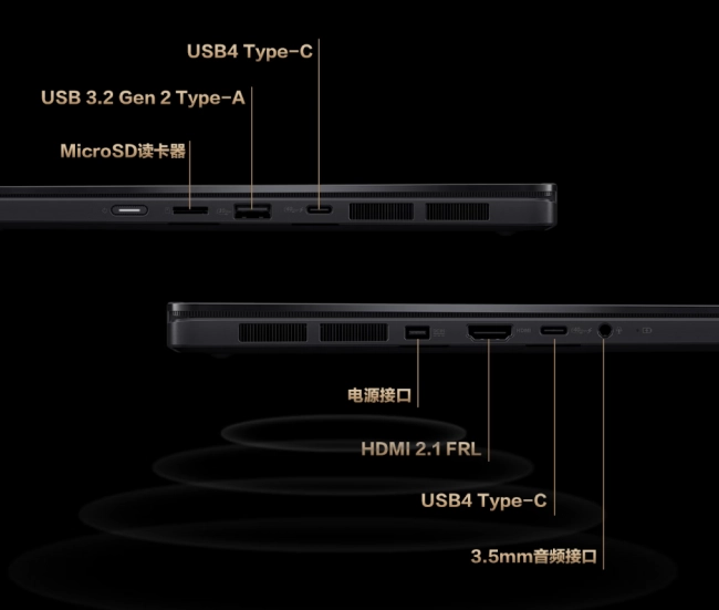 尽管机身轻薄,其接口配置却十分齐全:双 USB4 Type-C(支持数据传输、视频输出与 PD 充电)、USB 3.2 Gen 2 Type-A、HDMI 2.1 FRL、MicroSD 读卡器及 3.5mm 音频接口。这套组合全面覆盖了从高速存储卡导入、外接显示器到设备充电等专业需求,让你在户外也能搭建高效工作站,无需依赖扩展坞。同时,Wi-Fi 7 无线连接保障了高速稳定的网络传输,便于云端协作与大文件交换。