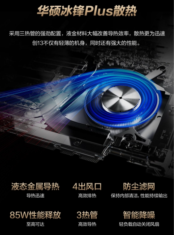 为保障高性能持续输出,它采用了华硕冰锋 Plus 散热系统,通过三热管与液态金属高效导热,配合四出风口设计,可实现高达 85W 的性能释放。智能降噪技术可在低负载时关闭风扇,确保在图书馆、会议室等安静环境下无干扰工作。用户可通过 Fn+F 快捷键,在安静、标准、高效等散热模式间快速切换,以适应不同场景的性能与静音需求。
