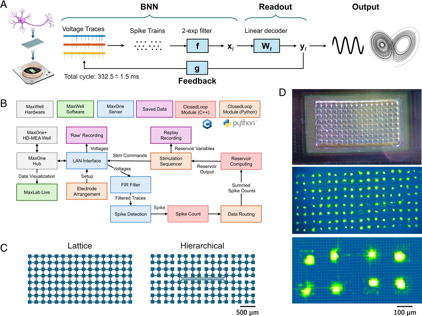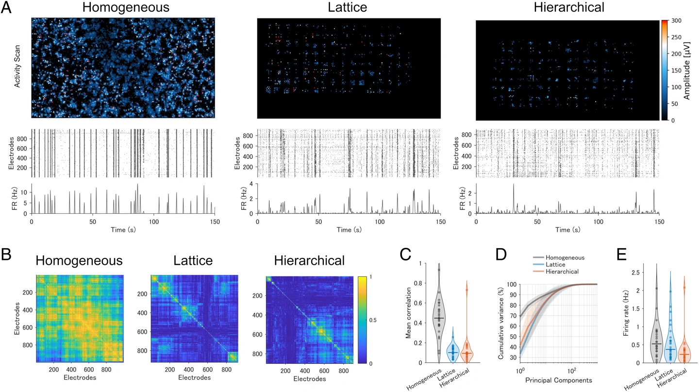 为此,他们利用PDMS(聚二甲基硅氧烷)微流控薄膜,将神经元胞体精准地限制在128个微型微孔中,再通过设计好的微通道进行连接。他们尝试构建了两种网络结构:格型和分层型。这种设计绝非限制自由,恰恰相反,它极大地提升了网络动力学的维度。效果立竿见影,神经元之间的两两相关性从0.45大幅降至0.12,这意味着网络具备了更丰富、更独立的动态响应能力。