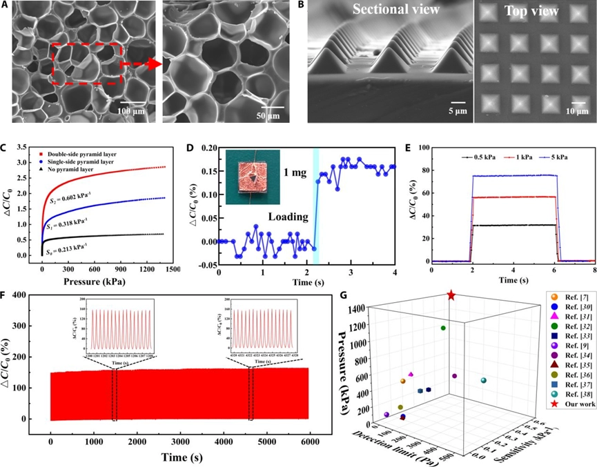 首先,是感知能力的突破。受螳螂腿部精妙结构的启发,团队设计出一种双微结构电容传感器。这款传感器的性能堪称“全能型选手”:它的检测下限极低,仅为0.10 Pa,这意味着即便如羽毛轻触般的微弱压力,也逃不过它的“感知”;同时,它的最大量程又高达1.4 MPa,足以承受剧烈跑跳时产生的高强度冲击。更值得一提的是其耐用性——经过12000次严苛的循环加载测试,传感器性能依然稳定,未见显著衰减。