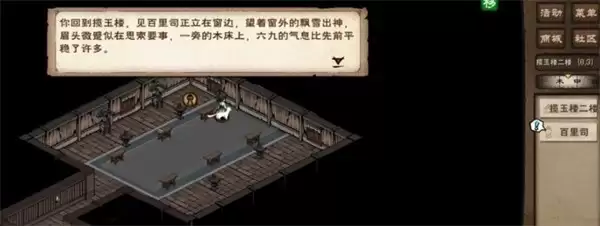 首先,在仰天岭地图随意移动触发来信事件。随后,前往坐标(22,9)的楼梯进入揽玉楼二楼,在(8,3)处与百里司对话。