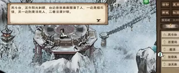 前往仰天岭(22,9)的楼梯处上楼触发剧情,在(15,11)的尸体处执行「检查」操作,原地与七四二对话后,从(12,11)进入无间狱。在无间狱(8,16)与四八五对话后,需耐心等待5分钟。