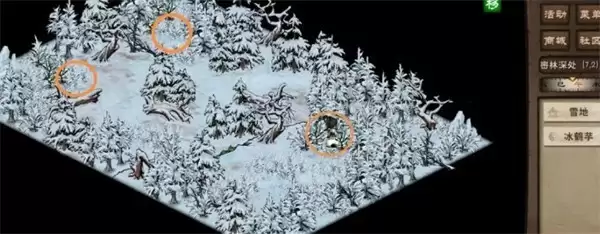 跃下后进入密林深处。依次在坐标(7,2)、(1,1)、(1,4)三个点位采集任务物品“冰鹤芋”。