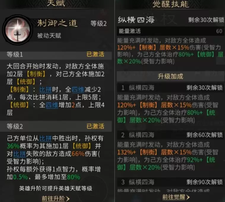 孙权的觉醒技能【纵横四海】,是一个融合了全体伤害与全体治疗的复合型技能。其精妙之处在于数值的动态成长性:战斗回合越往后推进,孙权通过天赋累积的【制衡】(敌方减益)与【统御】(己方增益)层数就越多,觉醒技能的伤害与治疗量也随之线性增长。这使其成为一个专为持久战设计的终结技,层数叠满后的爆发威力足以扭转战局。