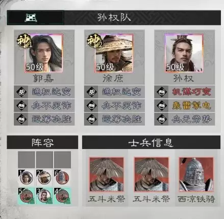 而孙权,则是这套体系稳固的基石与放大器。他提供的全域四维属性增益,能从本质上扩大敌我双方的属性差距,使队友的拼点胜率大幅提升。该阵容在内战对抗中表现卓越,对以郭嘉、徐庶、诸葛亮为代表的流行队伍构成显著克制。