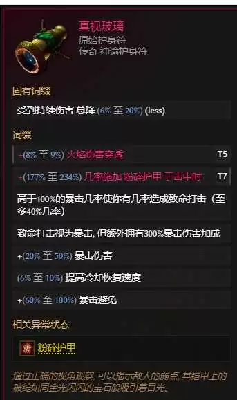 有两件核心装备构成伤害体系的支柱。首先是武器,其提供的高额技能等级加成与基础点伤是伤害计算的基石。采用双手武器并搭配「泰坦之心」胸甲,可额外获取15%全域伤害减免,收益显著。其次是项链部位。烈焰掠夺技能本身隐藏极高的暴击几率加成,这使得原始暗金「真视玻璃」成为无可替代的选择。它允许你忽略暴击几率堆叠,直接提供约170%的暴击伤害增幅,对于此BD而言是一次伤害层面的质变。