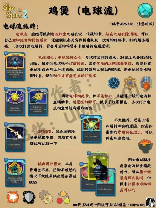 闪电球流聚焦于快速生成与频繁触发闪电球,通过“循环”、“增幅”和“静电释放”来实现伤害的指数级叠加。“聚焦”是此流派最关键的伤害倍增器,而“雷暴”则能提供强大的球体生成能力。构筑时需注意平衡防御,利用“均衡”或“冰川”等卡牌提升稳定性,以应对敌人前期的高压攻势,确保连锁反应顺利建立。