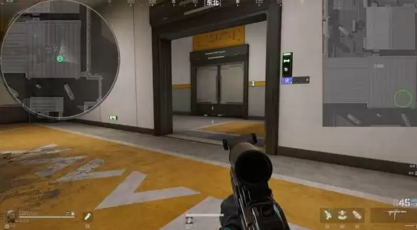 目标密码门位于右侧工业区——组装室的二层控制点。标准渗透路径:由主楼通道进入组装室主体结构,定位内部楼梯升至二楼,即可发现该加密门禁系统。