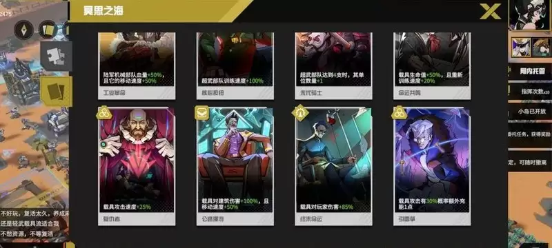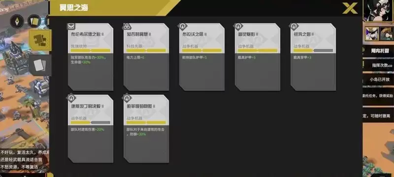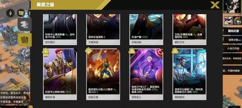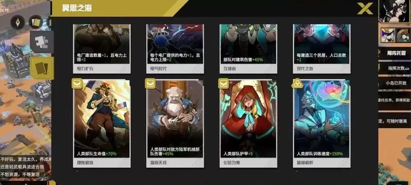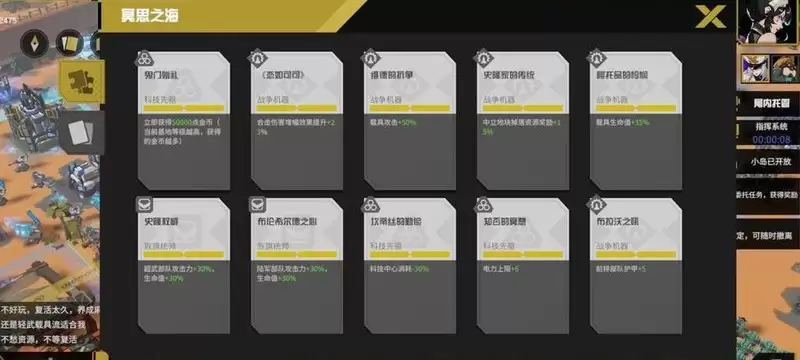 静思选择的逻辑很清晰:将超级武器、陆军前排护甲及各类载具的属性增益堆至上限,同时巩固部队与建筑的防御能力。剩余卡槽用于补充电力与人口资源。