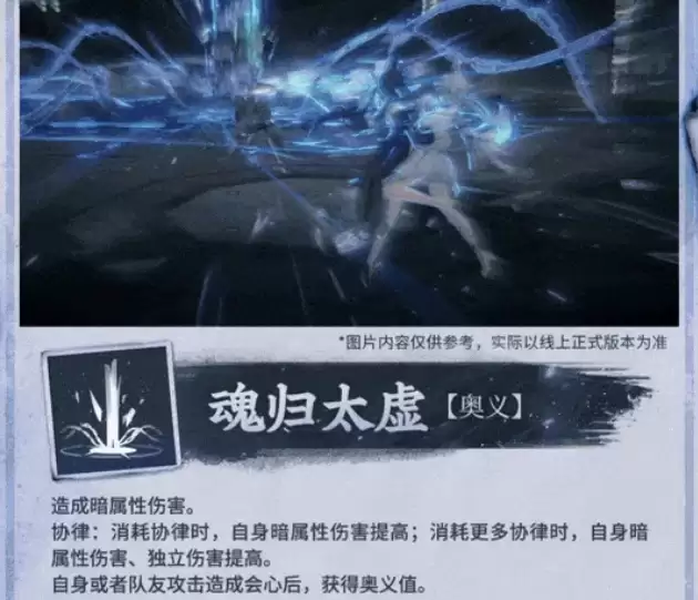 奥义技“魂归太虚”,为高倍率暗属性伤害技能。其特性在于可主动消耗储存的协律点数,按比例提升该次奥义的暗属性伤害。若投入的协律点数达到特定阈值,将额外提升独立伤害乘区的倍率。奥义值的累积机制与队伍会心率深度绑定:自身或队友触发会心一击时均可积攒能量。因此,构筑高会心率队伍能显著加速奥义循环频率,提升持续作战能力。