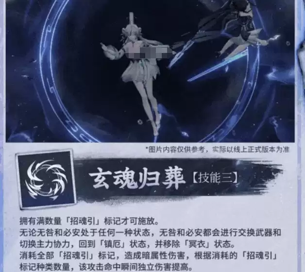 作为核心输出技,技能三“玄魂归葬”的释放必须满足“招魂引”标记全部集齐的前提。发动时,无论当前处于何种姿态或状态,角色都将强制复位至“镇厄”基础姿态,并清空“冥衣”。随后,消耗全部四类标记,进行一次强力的暗属性爆发攻击。最终伤害倍率直接关联被消耗的标记种类数量,集齐四种标记可触发满额伤害加成。这从机制上明确了最优循环路径:务必在攒齐四色标记后再释放此技能,以实现伤害收益最大化。
