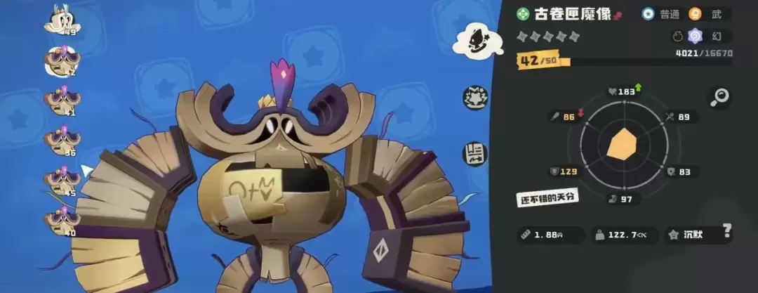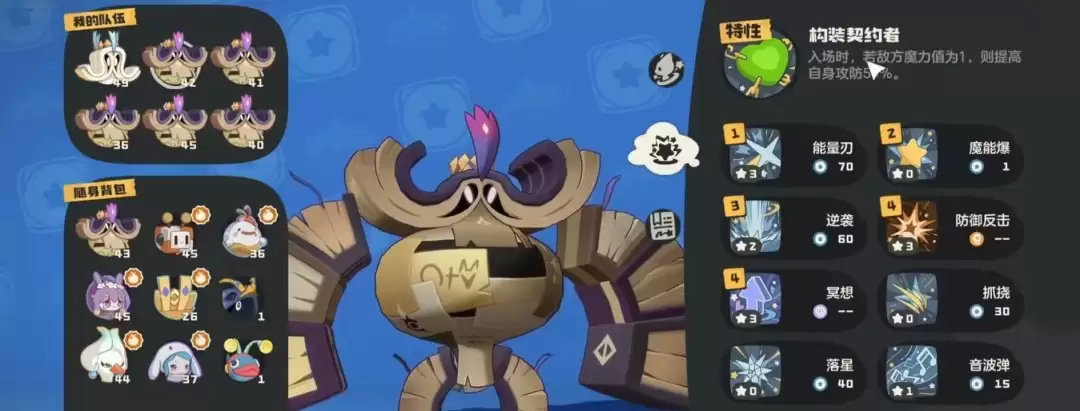 分析匣魔像的作战潜力,需从基础面板入手。其552点总资质分布为:生命85、物攻86、魔攻86、物防121、魔防79、速度95。攻击端数据中规中矩,但高达121的物防构成了其核心战术价值,使其在物理对抗中具备极佳的站场资本。性格选择上,明确强化防御、规避魔攻消耗的思路,淘气性格是最大化其坦度的不二之选。特性“构装契约者”是关键,入场时若对手魔力值为1,立即提升自身50%攻防,这为夺取先机提供了强力保障。