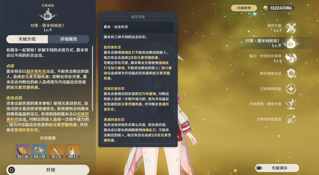 标准点按元素战技,将召唤处于「超厉害形态」的露米。该形态下,露米会交替进行普通岩伤与特殊的「月结晶」攻击,最大存在时间25秒,期间可至多触发五次月结晶伤害。