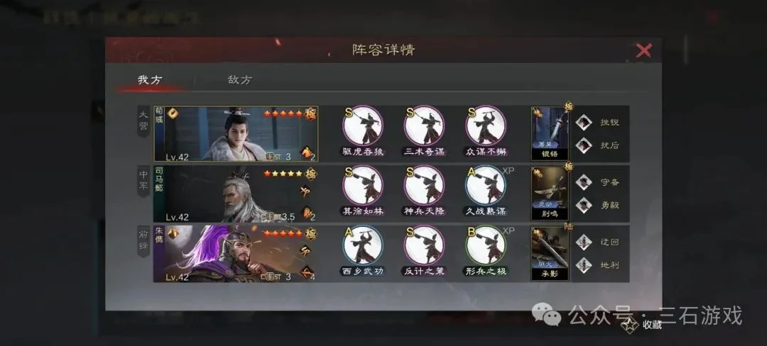 围绕司马懿构建的“朱马刀”体系,以其卓越的输出下限著称。朱儁携带的指挥战法“西乡武功”可提供稳定的群体谋略攻击,这四段伤害不仅构成了队伍稳定的伤害基底,更能高效触发司马懿的溅射效果。其附带的先手与减伤状态,进一步强化了队伍的生存与压制节奏。此阵容通常搭配荀彧等具备瞬发高谋略伤害的武将,将爆头与群体压血能力结合到极致。