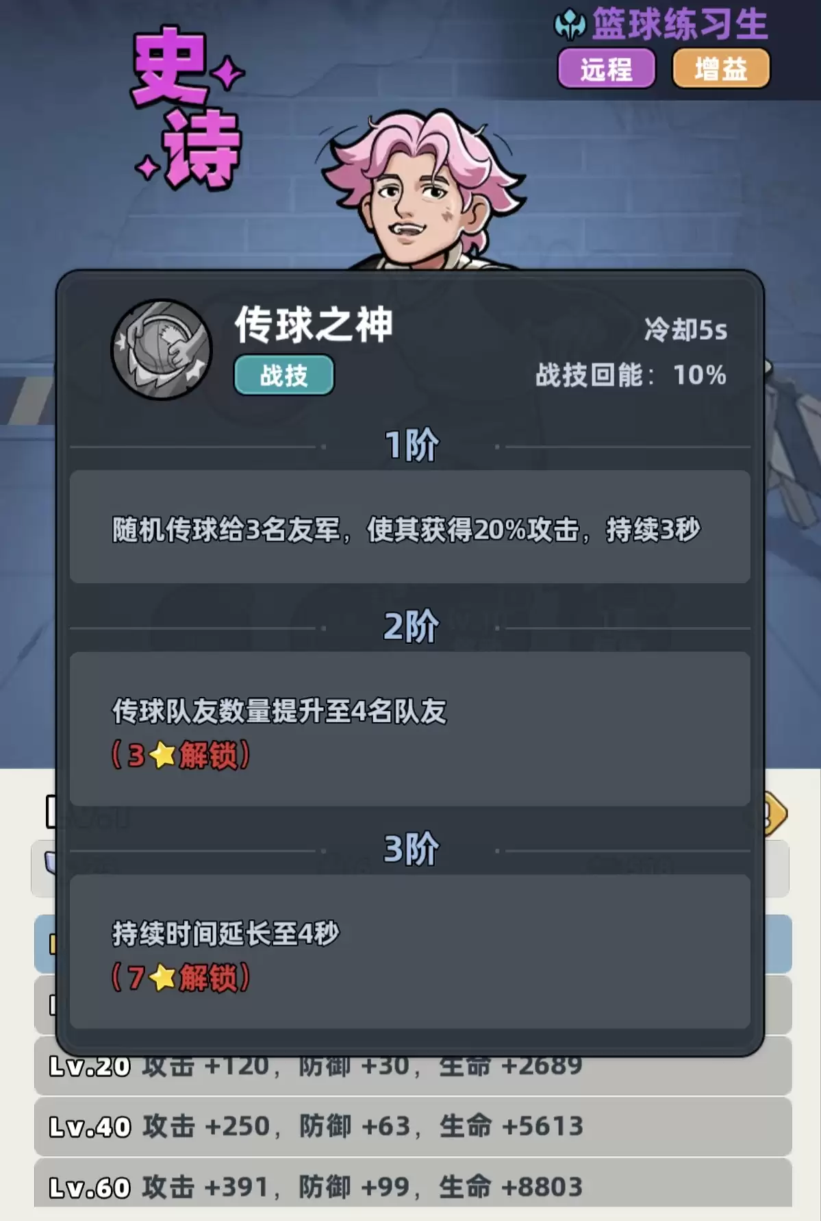 技能体系方面,战技“随机传球”可向三名友方单位施加攻击加成,随技能等级提升,受益人数增至四人,持续时间延长至4秒,冷却仅5秒。这意味着在标准战斗节奏中,全队约80%时间处于攻击增益覆盖下。大招“跳投篮球”为范围伤害技能,基础倍率高,且每升一级伤害增幅显著;同时具备远程敌人伤害加成机制,使其在应对分散站位敌群时表现尤为突出。被动效果进一步强化协同性:当传球目标为战士或远程职业时,额外提升其攻击加成比例。综合来看,该角色在前期拥有全图鉴最顶尖的AOE清怪效率,是推图开荒阶段不可替代的核心输出。