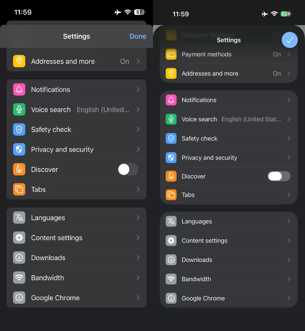 这里的改动更体现功力。原来的上下文菜单背景模糊效果被移除了,换成了更现代化的纯色风格,阅读起来反而更清晰。底部弹出的菜单也不再是僵硬的“全屏宽度”,边角变得圆润柔和,这其实就是“液态玻璃”设计哲学的核心——让数字界面有流体的柔和感。设置界面里的小对勾图标、开关按钮,也都换上了新皮肤。这些细节,你不一定一眼能指出,但用起来就是会觉得更舒服。