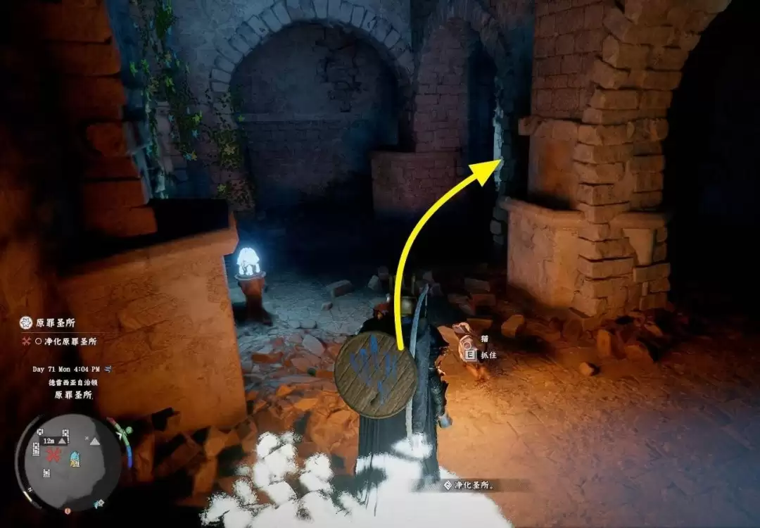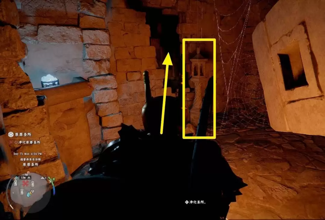 到达下层区域后,首先会看到净化圣所任务相关的任务方块。其侧方即为目标——一个石灯笼。正确点燃此灯笼后,前方房间的尖刺陷阱将即刻解除。