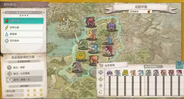(野外孵育界面左下角,清晰地列出了该地图能提供的生态技能与能力提升)