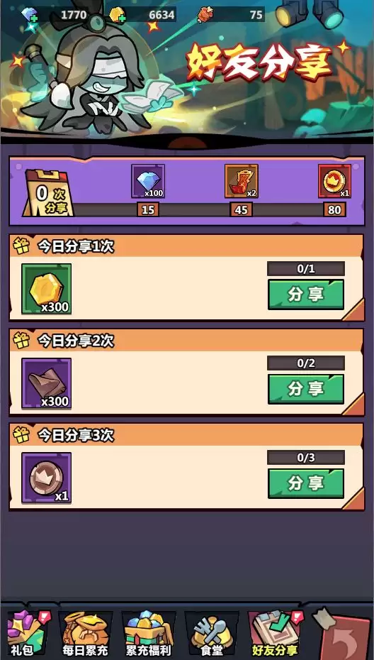 好友分享功能,每日分享可以获得相应的奖励,累计达到一定次数,还可以获得总分享次数的额外奖励哦,快拉上你的好友一起游戏吧