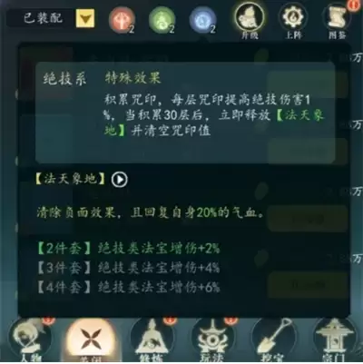 绝技系法宝专注于提升角色的生存与反制能力,其被动资源为“咒印”。咒印累积至30层时,神通【法天象地】瞬间激活。该技能效果极其纯粹且强大:立即解除角色身上所有控制、中毒、灼烧等负面状态,并基于角色最大生命值回复20%的气血。在面对高控制阵容或濒死绝境时,这是实现极限续航与战术反转的核心依仗。