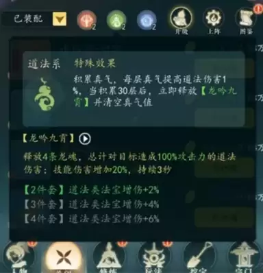 道法系法宝的运行逻辑与飞剑系相似,依靠技能命中积累“真气”层数。每层真气同样提升道法系1%伤害。真气蓄满30层后,神通【龙吟九霄】即刻触发。该技能在造成直接伤害后,会为施法者附加一个持续3秒的增益状态,使在此期间施放的所有法宝技能伤害提升20%,是集火秒杀核心目标或快速清场的最佳时机。
