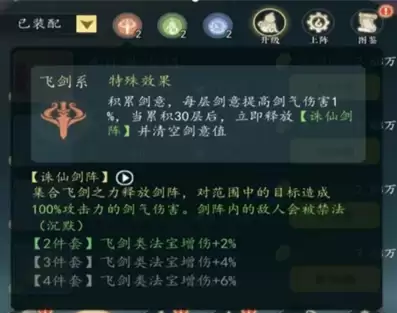 每次使用飞剑系法宝技能,角色将获得1层“剑意”。每层剑意不仅能永久提升飞剑系1%的伤害输出,更是激活终极神通【诛仙剑阵】的关键。当剑意叠加至30层,【诛仙剑阵】自动发动,对指定区域造成范围性法术伤害,并使范围内的所有目标陷入“禁法”状态,有效打断敌方技能循环,夺取战斗主动权。
