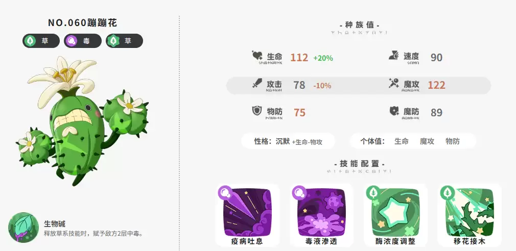 特性:生物碱(释放草系技能时,赋予敌方2层中毒)